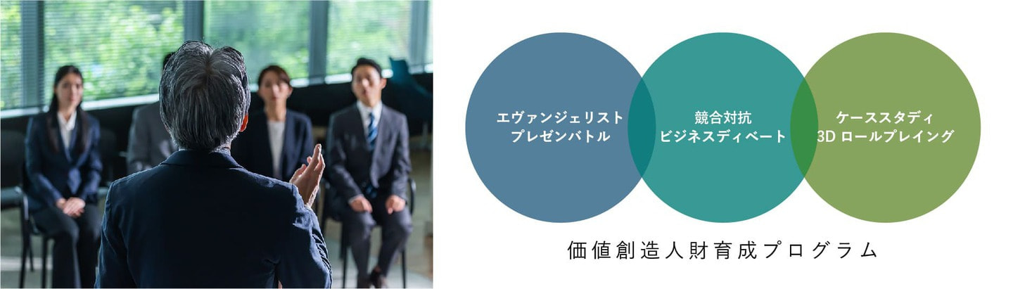 厳しい環境変化に対応できる、成果を上げるマーケッター・営業マンを育成します。 新たに開発した教育システム:プレゼンバトル→競合対応ディベート→3Dロールプレイングなどを通じ、感性価値を伝える伝道者となるマーケッター、そして物語を語る営業マンを育成する研修を提供いたします。変革を促し戦力になる人財育成をサポートさせていただきます。