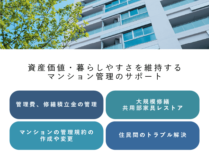 「運営コストの削減」や「会計処理の方法」といった組織運営に関することから、「建物の修繕や建て替えが必要になったときの工事会社の選定」などについて、また「住民同士のトラブル解決」などに的確なアドバイスをさせていただきます。暮らしやすさ・資産価値を維持するマンション管理のサポートをさせていただきます。