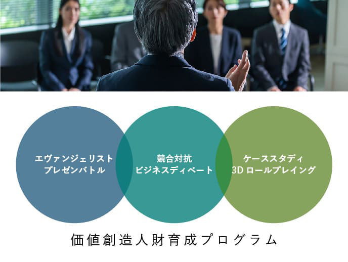 厳しい環境変化に対応できる、成果を上げるマーケッター・営業マンを育成します。 新たに開発した教育システム:プレゼンバトル→競合対応ディベート→3Dロールプレイングなどを通じ、感性価値を伝える伝道者となるマーケッター、そして物語を語る営業マンを育成する研修を提供いたします。変革を促し戦力になる人財育成をサポートさせていただきます。