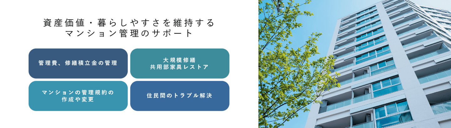 「運営コストの削減」や「会計処理の方法」といった組織運営に関することから、「建物の修繕や建て替えが必要になったときの工事会社の選定」などについて、また「住民同士のトラブル解決」などに的確なアドバイスをさせていただきます。暮らしやすさ・資産価値を維持するマンション管理のサポートをさせていただきます。